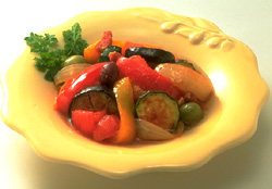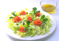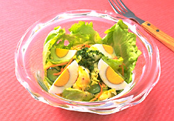 野菜の重量の1.5%の塩(小さじ2弱)を加えてもみ、全体がしんなりしてきたら水気を絞ります。フレンチドレッシング60ml、オリーブ油大さじ1、粒マスタード小さじ2、こしょう少々を混ぜ合わせてドレッシングを作り、野菜を入れてあえます。器に盛ってパセリをちらし、ゆで卵を飾ります。