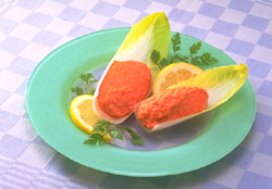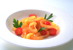 グリーンアスパラガス8本は根元の固い部分を取り除き、下から1/3のところまで、皮をむき、よく水気をきっておきます。エビは8尾は背わたを取り、尾に近い一節を残して殻をむきます。尾の先端を切って水をしごき出し、中心の尖った部分を背側に折っておきます。腹側に4〜5箇所切込みを入れ、塩、レモン汁をふりかけます。フェンネルは1/4に切り、薄くくし型に切ります。