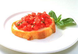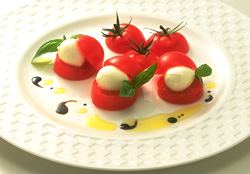 大きめのミニトマト12個は盛ったときに安定するように下の部分を少々切り落とし、ヘタのついている方をふたのように斜めに切ります。トマトにミニのモッツァレッラチーズ12個をはさみながら盛り付けます。(大きいモッツァレッラチーズの場合はトマトのサイズに合わせて切ります。)塩、こしょうをふり、エキストラバージンオリーブオイル、バルサミコ酢をかけ、バジルを添えます。
