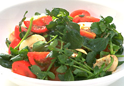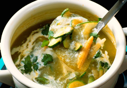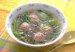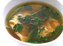 鍋に水3カップ、長ねぎの青みの部分5cm、しょうがの薄切り2枚、中華スープの素、しょうゆ大さじ1、沸騰したらワンタン20個を1個ずつ加えます。再び煮立ったらクレソン1束を4つに切ったものを加えて、塩、こしょうで味をととのえます。