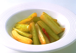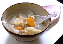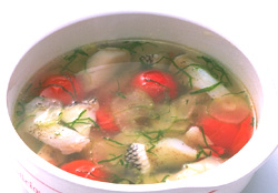 銀むつ1切れはそぎ切りにし、セロリの葉のせん切り1本分、ナンプラー(魚醤)小さじ2、こしょう少々で下味をつけておきます。鍋にサラダ油小さじ2を熱し、銀むつを入れて炒め、色が変わったら水3カップを加えます。煮立ったら弱火にして5分熱し、セロリの薄切り1本分、ミニトマト20個をヘタを取り除いて加え、ナンプラー大さじ1で調味します。