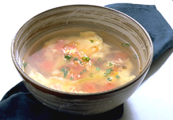 葉ねぎ3本は、根元の部分を4cmの長さに切り、残りの部分は小口切りにします。鍋に油大さじ1を熱し、4cmの葉ねぎを香りがでるまで炒め、種を取り除いてざく切りにしたトマト1個を、しんなりするまで炒めます。ここにスープストックを加え、沸騰したら溶き卵1個分をまわし入れて、塩、こしょうで味をととのえます。小口切りのねぎを加え、ごま油少々を加えます。 出典:『酒井美代子の今夜は台湾料理』(酒井美代子 著、農文協刊)