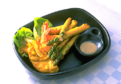 グリーンアスパラガス、エビ、フェンネルに衣をつけ、170℃の油で揚げます。
